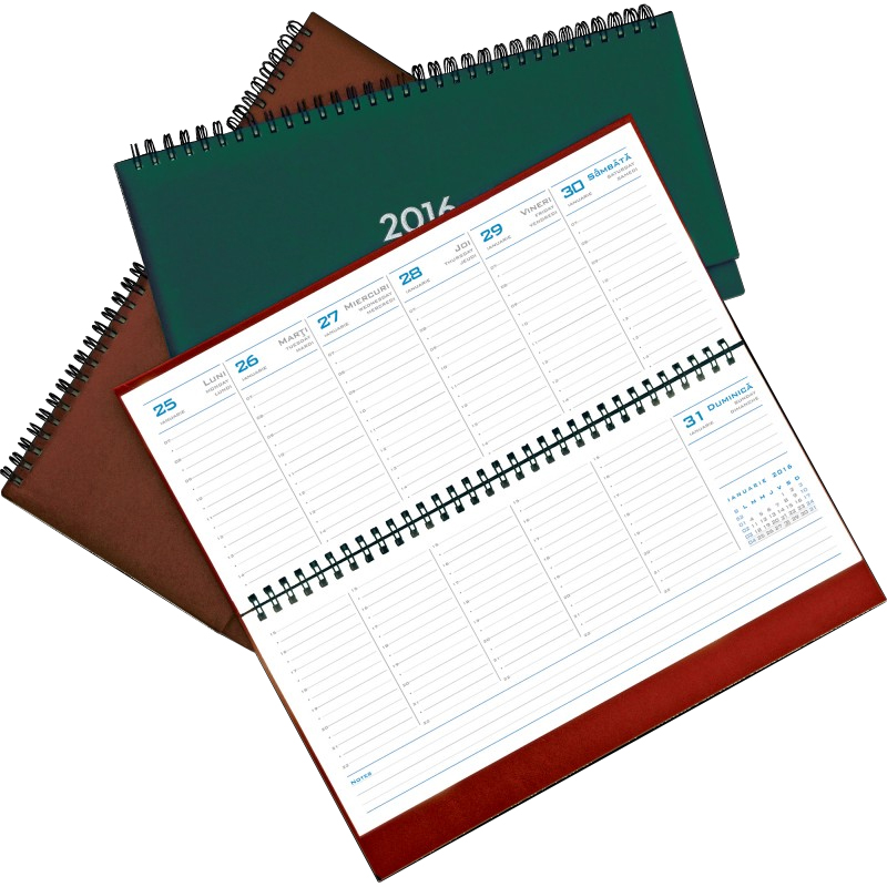 Agenda nedatata A5 “CLASSIC” – 14 x 20.5 cm, 224 pagini, 2 culori ( albastru si gri ), hartie offset import alba, 70 g/mp, coperti caserate cu material imitatie pluta, spirala metalica, personalizare pe coperta cu folio negru/auriu Agenda planner datata ” EUROTIME”- 28 x12 cm, 108 pagini, interior 2 culori : albastru si gri, hartie offset import alba, 70 g/mp, coperti buretate, spirala metalica, personalizare pe coperta cu folio negru/auriu Calendar birou ” ROMANIA” – 23 x 11 cm, 12 file, hartie dublu cretata 150 g/mp, spira metalica alba Personalizare : 23 x 3 cm, in partea inferioara a calendarului, folio negru/auriu pe support carton 400 g/mp, caserat cu material imitatie pluta Personalizare : 23 x 3 cm, in partea inferioara a calendarului, folio negru/auriu pe support carton 400 g/mp, caserat cu material imitatie pluta